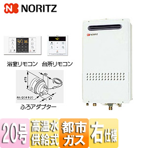 ガス給湯器[浴室・台所リモコン+ふろアダプターセット][屋外壁掛型][PS設置型][高温水供給式][クイックオート][20号][20A][都市ガス][ふろアダプター右仕様]