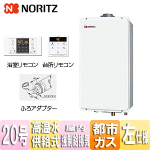 ガス給湯器[浴室・台所リモコン+ふろアダプターセット][屋内壁掛型][上方排気][強制給排気][高温水供給式][クイックオート][20号][20A][都市ガス][ふろアダプター左仕様]