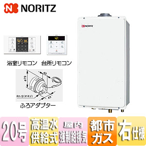ガス給湯器[浴室・台所リモコン+ふろアダプターセット][屋内壁掛型][上方排気][強制給排気][高温水供給式][クイックオート][20号][20A][都市ガス][ふろアダプター右仕様]