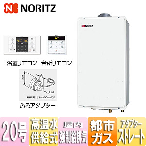 ガス給湯器[浴室・台所リモコン+ふろアダプターセット][屋内壁掛型][上方排気][強制給排気][高温水供給式][クイックオート][20号][20A][都市ガス][ふろアダプターストレート]
