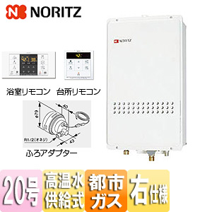 ガス給湯器[浴室・台所リモコン+ふろアダプターセット][PS扉内設置型][後方排気][高温水供給式][クイックオート][20号][20A][都市ガス][ふろアダプター右仕様]