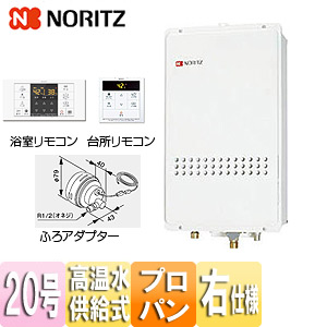 ガス給湯器[浴室・台所リモコン+ふろアダプターセット][PS扉内設置型][後方排気][高温水供給式][クイックオート][20号][20A][プロパンガス][ふろアダプター右仕様]