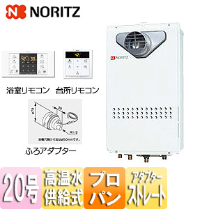 ガス給湯器[浴室・台所リモコン+ふろアダプターセット][PS扉内設置型][前面排気][延長可能][高温水供給式][クイックオート][20号][20A][プロパンガス][ふろアダプターストレート]