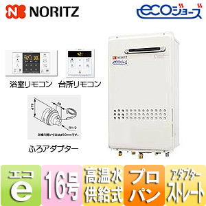 ガス給湯器[エコジョーズ][浴室・台所リモコン+ふろアダプターセット][屋外壁掛型][PS設置型][高温水供給式][クイックオート][16号][15A][プロパンガス][ふろアダプターストレート]