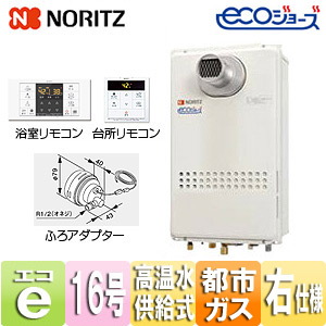 ガス給湯器[エコジョーズ][浴室・台所リモコン+ふろアダプターセット][PS扉内設置型][前面排気][延長可能][高温水供給式][クイックオート][16号][15A][都市ガス][ふろアダプター右仕様]