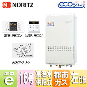 ガス給湯器[エコジョーズ][浴室・台所リモコン+ふろアダプターセット][PS扉内設置型][後方排気][高温水供給式][クイックオート][16号][15A][都市ガス][ふろアダプター左仕様]