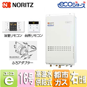 ガス給湯器[エコジョーズ][浴室・台所リモコン+ふろアダプターセット][PS扉内設置型][後方排気][高温水供給式][クイックオート][16号][15A][都市ガス][ふろアダプター右仕様]