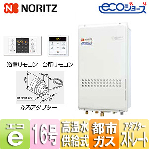 ガス給湯器[エコジョーズ][浴室・台所リモコン+ふろアダプターセット][PS扉内設置型][後方排気][高温水供給式][クイックオート][16号][15A][都市ガス][ふろアダプターストレート]