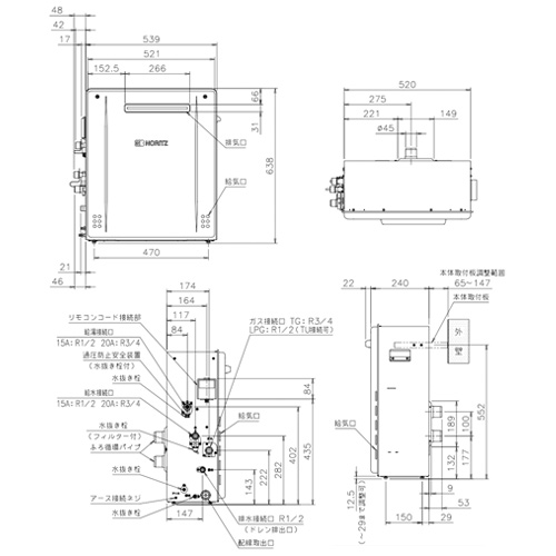 ガスふろ給湯器[エコジョーズ][本体のみ][浴槽隣接設置][屋外据置型][シンプル][オート][20号][20A]