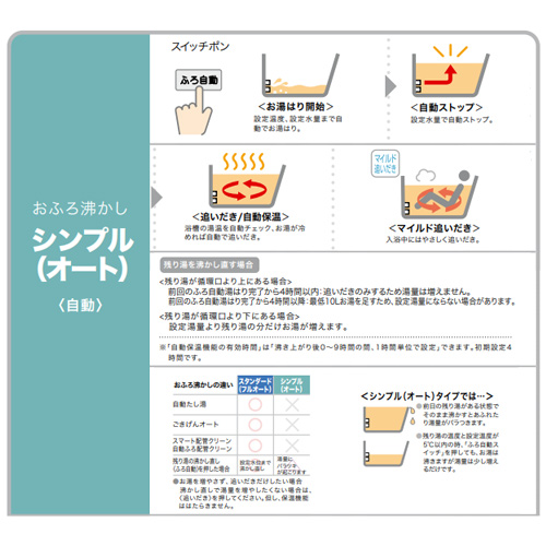 シンプルはオート機能で、自動たし湯などの機能はありません。またスマート配管クリーンもありません。