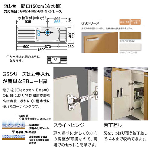 流し台(3段引出し) セクショナルキッチンGSシリーズ[木製キャビネット][点検口付][間口150cm][ライトグレー]
