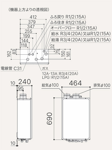 ガスふろ給湯器[浴室・台所リモコンセット][屋内壁掛型][上方排気][強制給排気][シンプル][オート][20号][20A]