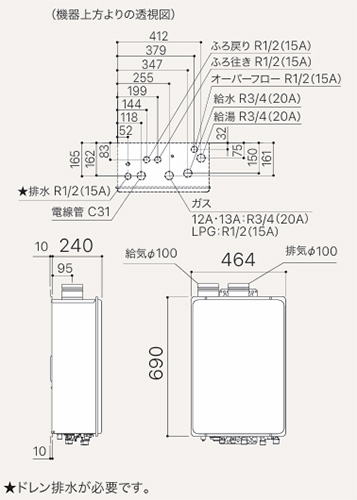 ガスふろ給湯器[エコジョーズ][浴室・台所リモコンセット][屋内壁掛型][上方排気][強制給排気][シンプル][オート][24号][20A]