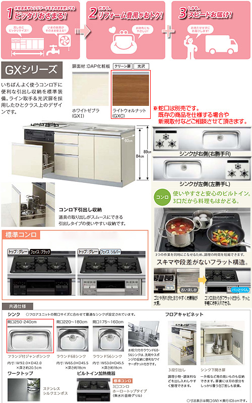 GXは、ホワイトゼブラ(GXI)とライトウォルナット(GXC)の扉カラー2種類ございます。