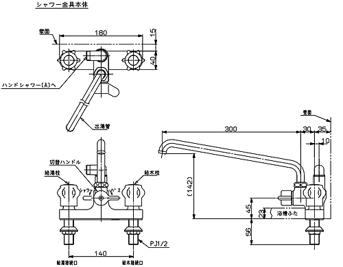 シャワー金具[MS][2バルブ][シャワーハンガー2個付][一般地][壁貫通タイプ][給湯器部材]