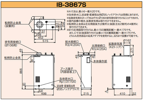 また、排気筒使用時の場合は、別売りφ106排気筒セット(アミ付エルボトップ仕様)を使用して下さい