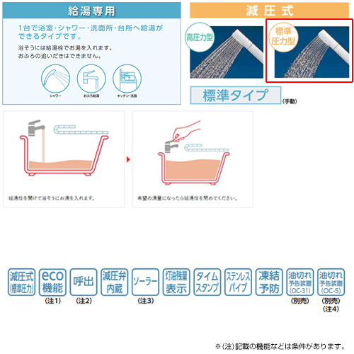「給湯専用 標準タイプ」は、1台で浴室・シャワー・洗面所・台所へ給湯ができるタイプです。