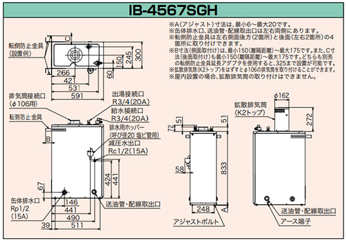 また、排気筒使用時の場合は、別売りφ106排気筒セット(アミ付エルボトップ仕様)を使用して下さい