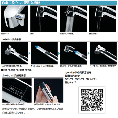 長寿命カートリッジの為、交換回数が少なく、交換作業も簡単な新設設計のオールインワン浄水栓。