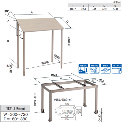 ・固定寸法:W300〜849 D160〜380