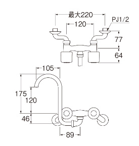 キッチン用蛇口[壁][2ハンドル混合水栓][スパウト105mm][一般地寒冷地共用]