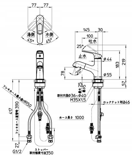 洗面用蛇口[台][シングルワンホール洗面混合栓][省施工ナット付][泡沫][ホース引出し][スパウト145mm][一般地]