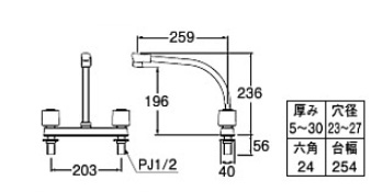 キッチン用蛇口[台][2ハンドル混合水栓][スパウト259mm][湯水芯203mm][一般地寒冷地共用]