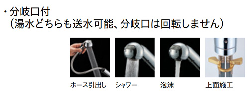 湯水どちらでも可能な分岐口付き水栓です。