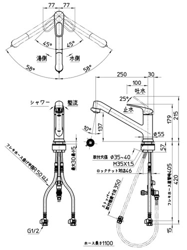 キッチン用蛇口[台][シングルワンホールスプレー混合栓][省施工ナット付][ホース引出式][整流][スパウト250mm][寒冷地]