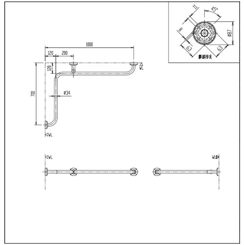 ●手すり[壁固定][L型][入隅型][浴室用][長さ:600mm][φ34][前出:120mm][樹脂被覆タイプ][ホワイト]