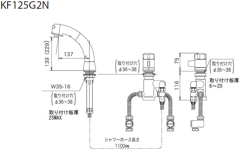 KF125G2N|KVK|洗面用蛇口[台][洗髪シャワー水栓][サーモスタット式混合水栓][ホース引出式][取付穴径:φ36〜38mm][一般地]|リフォームネクスト