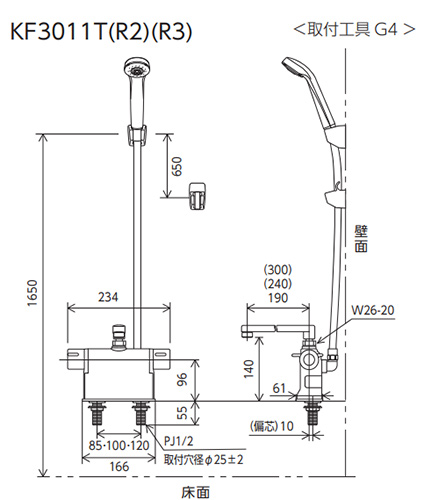 [撥水加工CP]浴室用蛇口 KF3011Tシリーズ[台][浴槽・洗い場兼用][サーモデッキシャワー混合水栓][首長240mm][可変ピッチ式][シャワーヘッド(めっき)][メタリックホース][寒冷地]