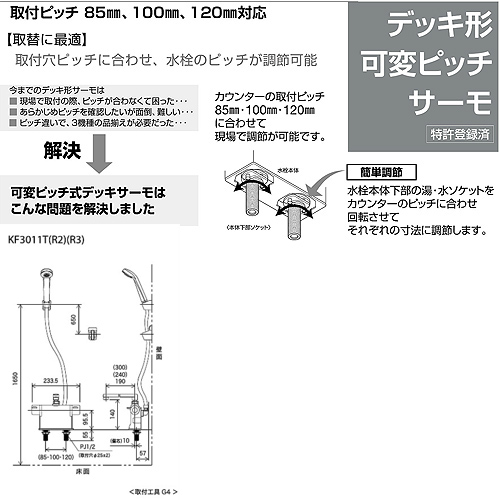 [撥水加工CP]浴室用蛇口 KF3011Tシリーズ[台][浴槽・洗い場兼用][サーモデッキシャワー混合水栓][ワンストップ][めっき][首長300mm][可変ピッチ式][寒冷地]