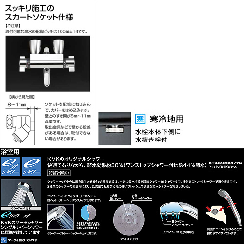 KF800WTG|KVK|浴室用蛇口 スカートソケットシリーズ[壁][浴槽・洗い場兼用][サーモスタット付シャワーバス混合水栓][eシャワーNF][170mmパイプ付][寒冷地]|リフォームネクスト