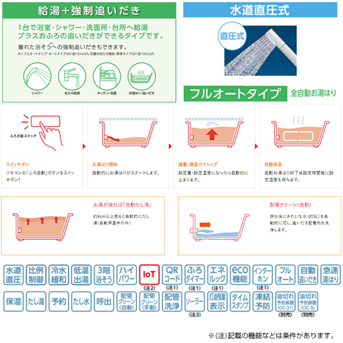 「フルオートタイプ」はスイッチポンでおふろの準備OK。片道15m以内の離れた浴そうへの強制追いだきも可能です。