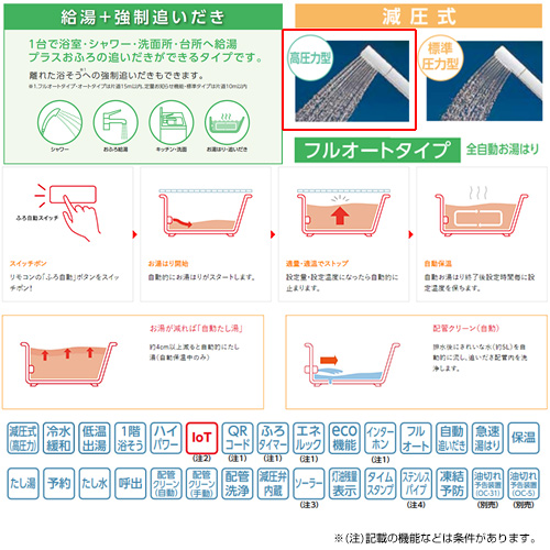 「フルオートタイプ」はスイッチポンでおふろの準備OK。片道15m以内の離れた浴そうへの強制追いだきも可能です。