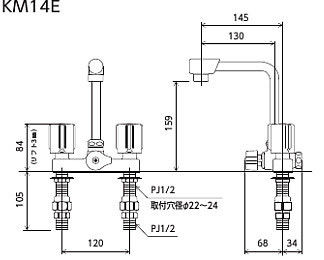 KM14E|KVK|洗面用蛇口[台][2ハンドル混合水栓][湯水芯120mm][一般地]|リフォームネクスト