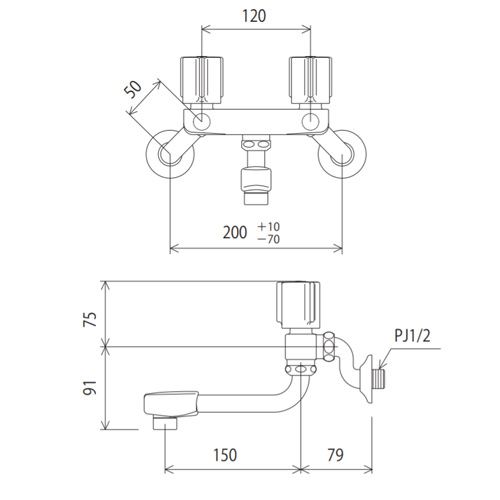 浴室用蛇口[壁][2ハンドル混合水栓][150mmパイプ付][固定こま][寒冷地]
