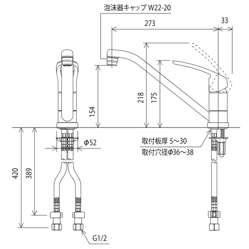 キッチン用蛇口[台][シングルレバー混合水栓][泡沫][吐水口回転規制80度][スパウト273mm][一般地]