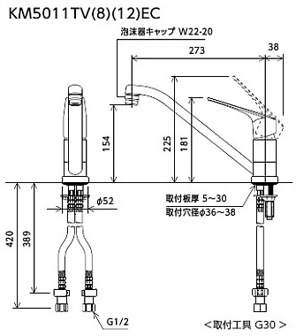 KM5011TV8EC|KVK|キッチン用蛇口[台][シングルレバー混合水栓][泡沫][スパウト273mm][一般地]|リフォームネクスト