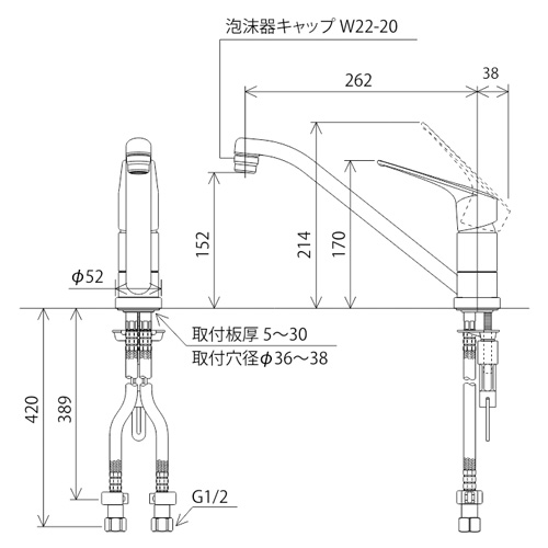 キッチン用蛇口[台][シングルレバー混合水栓][泡沫][eレバー][スパウト262mm][撥水][寒冷地]
