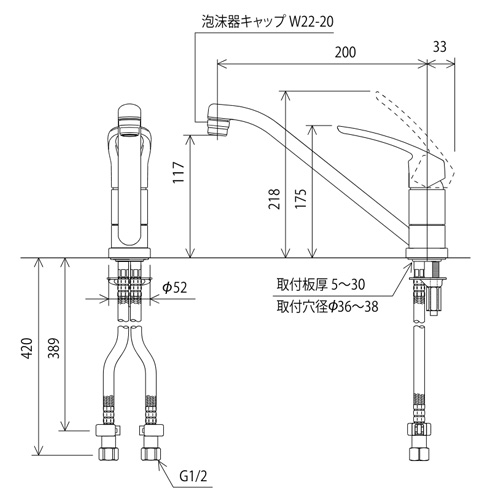 キッチン用蛇口[台][シングルレバー混合水栓][泡沫][吐水口回転規制80度][スパウト200mm][寒冷地]