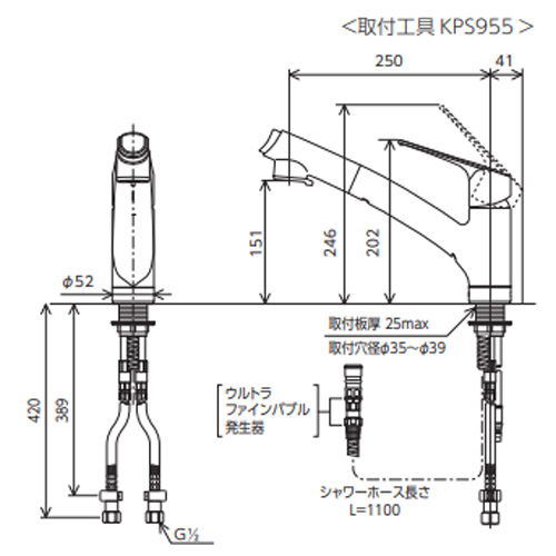 キッチン用蛇口[台][シングルレバー混合水栓][ホース引出式][ウルトラファインバブル付][スパウト250mm][寒冷地]