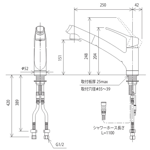 キッチン用蛇口[台][シングルレバー混合水栓][ホース引出式][スパウト250mm][撥水][寒冷地]