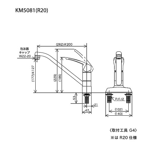 KM5081R20|KVK|キッチン用蛇口[台][シングルレバー混合水栓][流し台用][泡沫][首長200mmパイプ付][湯水芯102mm][一般地]|リフォームネクスト