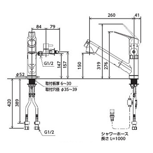 キッチン用蛇口[台][シングルレバー混合水栓][浄水カートリッジ付属][ホース引出式][eレバー][分岐止水栓付][スパウト260mm][寒冷地]