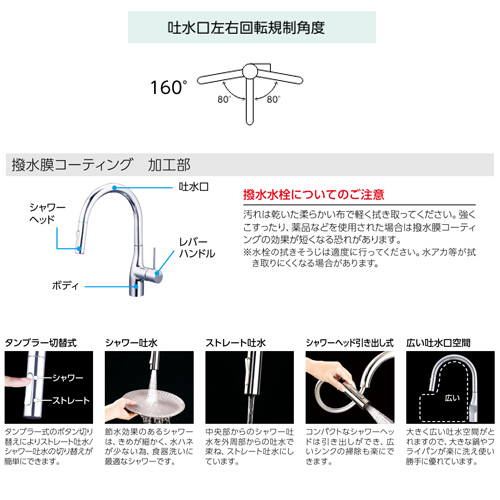 大きく広い吐水空間がとれますので、大きな鍋やフライパンが楽に洗え使い勝手に優れています。
