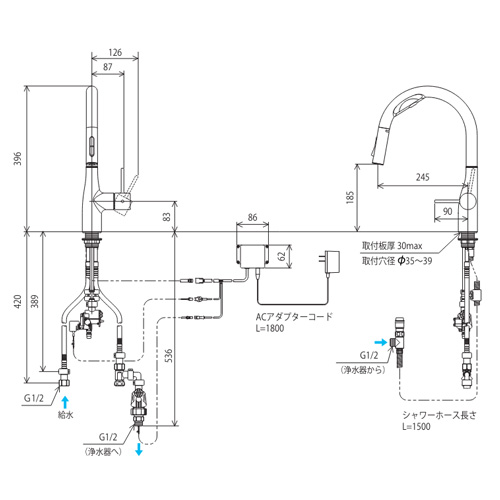 キッチン用蛇口[台][シングルレバー混合水栓][浄水カートリッジ付属][ホース引出式][グースネック][AC100Vタイプ][Wセンサー付][スパウト245mm][撥水][一般地]