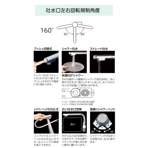 大きく広い吐水空間がとれますので、大きな鍋やフライパンが楽に洗え使い勝手に優れています。