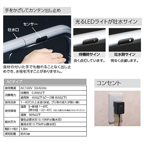 手をかざして簡単出し止めができるセンサータイプ。